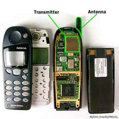মোবাইল ফোনের মধ্যে যে ট্রান্সমিটার থাকে সেগুলো বেশ কম শক্তির হয়ে থাকে। সেলফোন ০.৭৫ থেকে ১ ওয়াট শক্তিতেই দিব্যি চলতে পারে। ফোনের নির্মাতাভেদে এর ভেতরে ট্রান্সমিটারের অবস্থান বিভিন্ন জায়গায় হতে পারে; তবে সাধারনত এটি ফোনের এন্টেনার খুব কাছাকাছি থাকে।